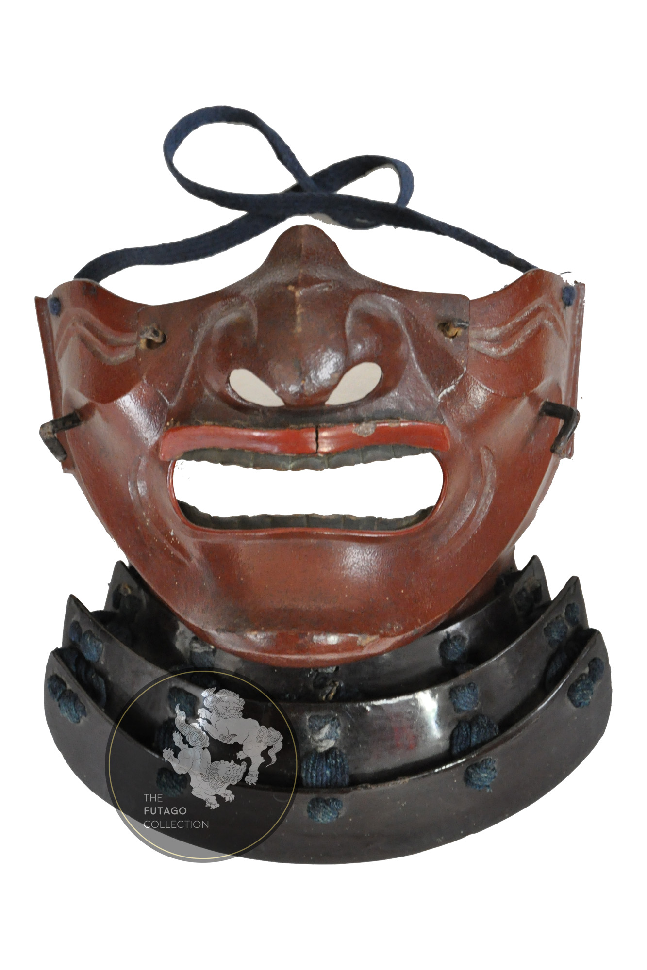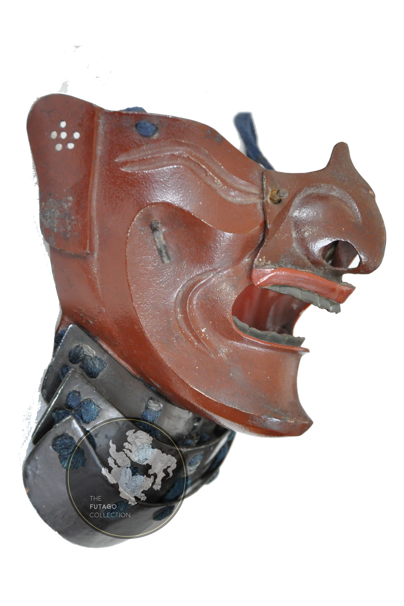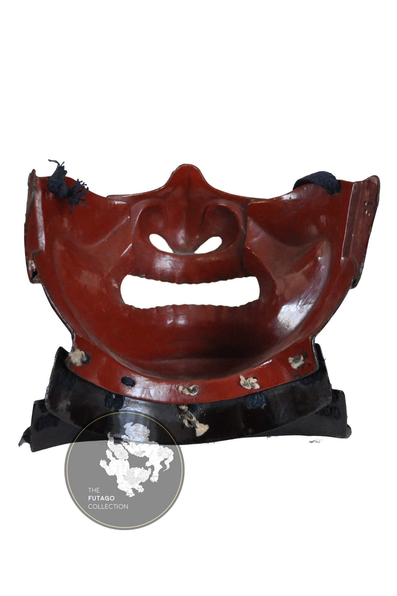 The matching sangu also lacquered in red. The kanmuri ita and the Tekkó on the Kote, decorated with the Kimata family mon the tomoe crest.