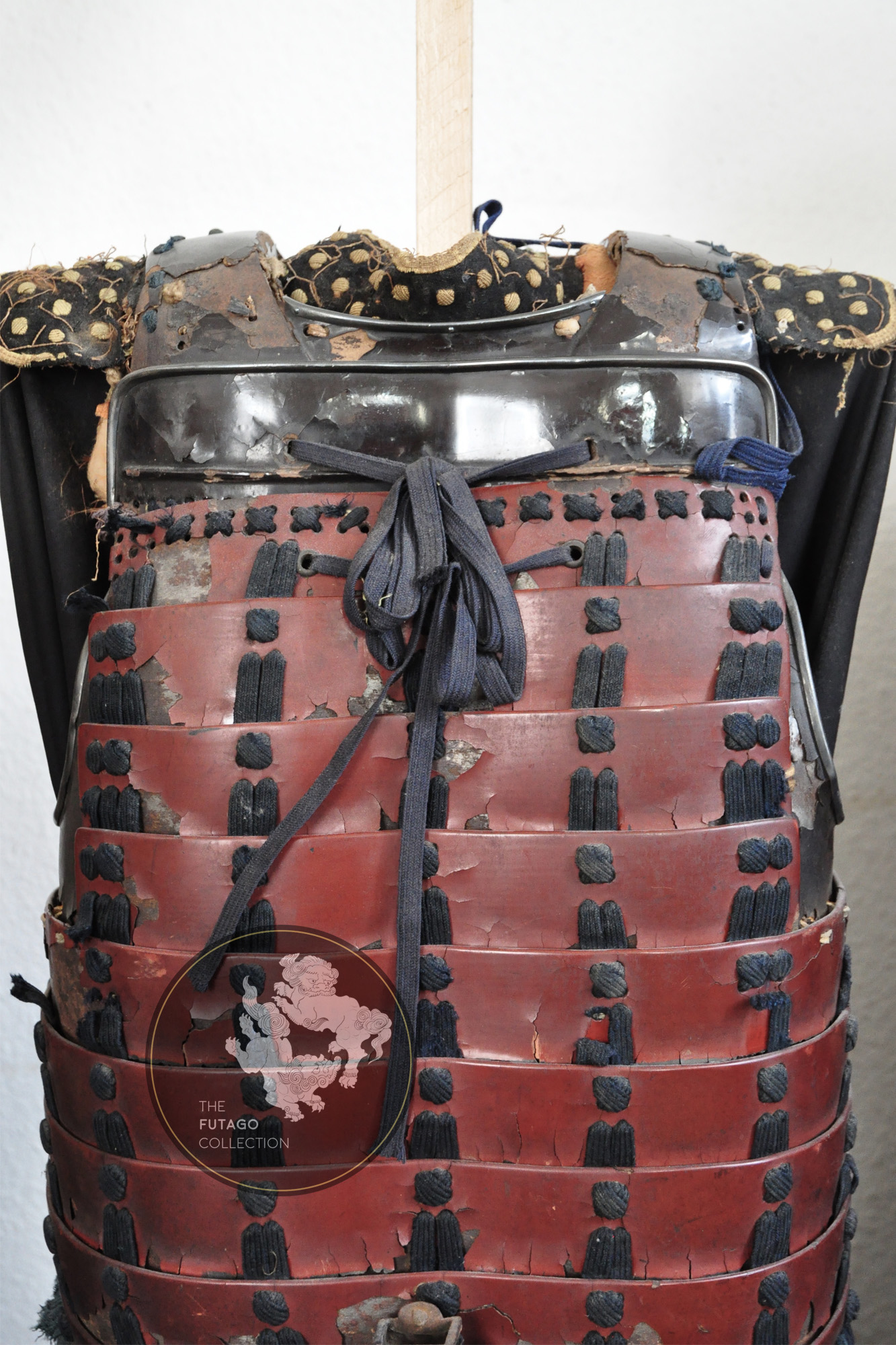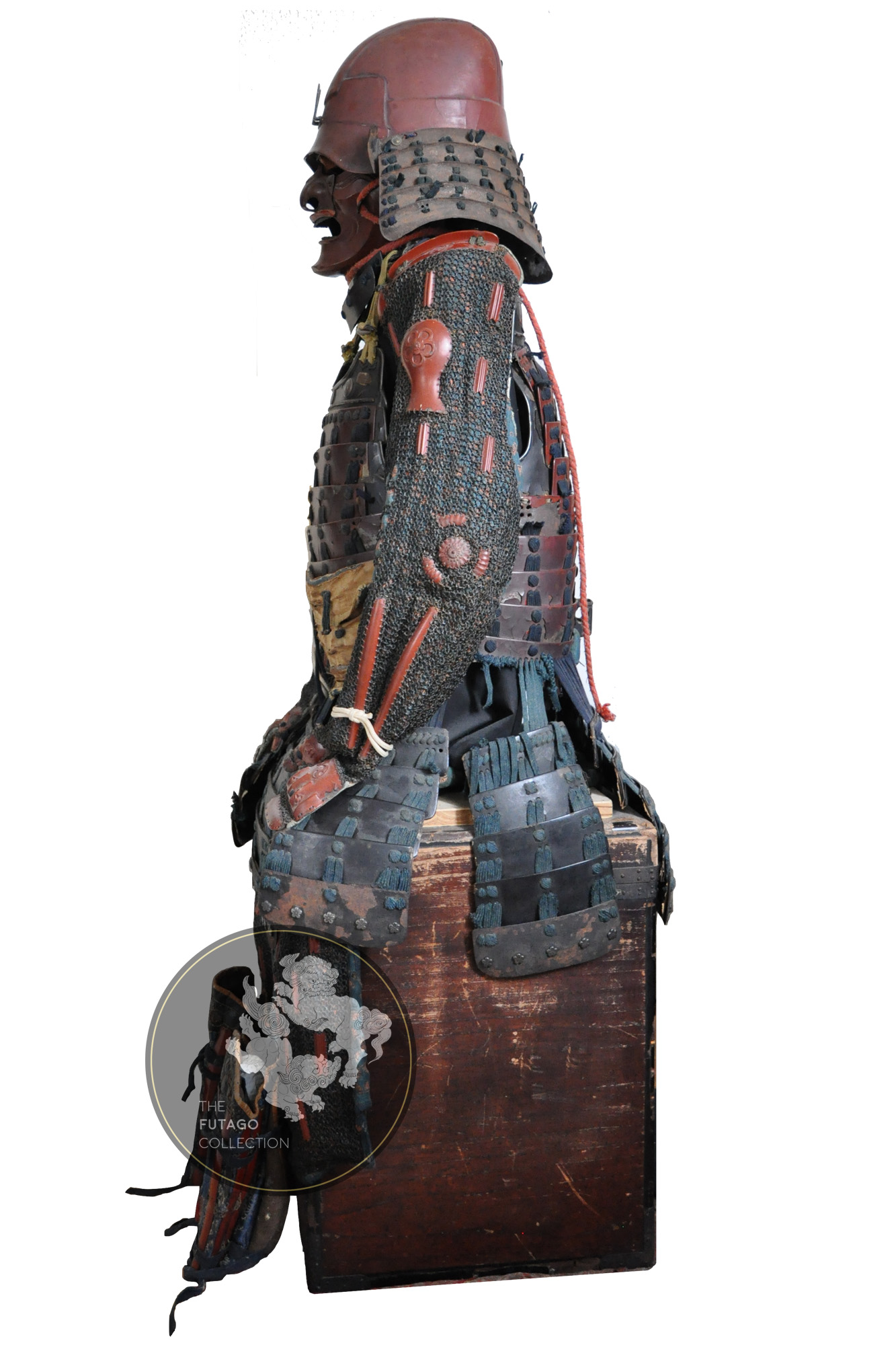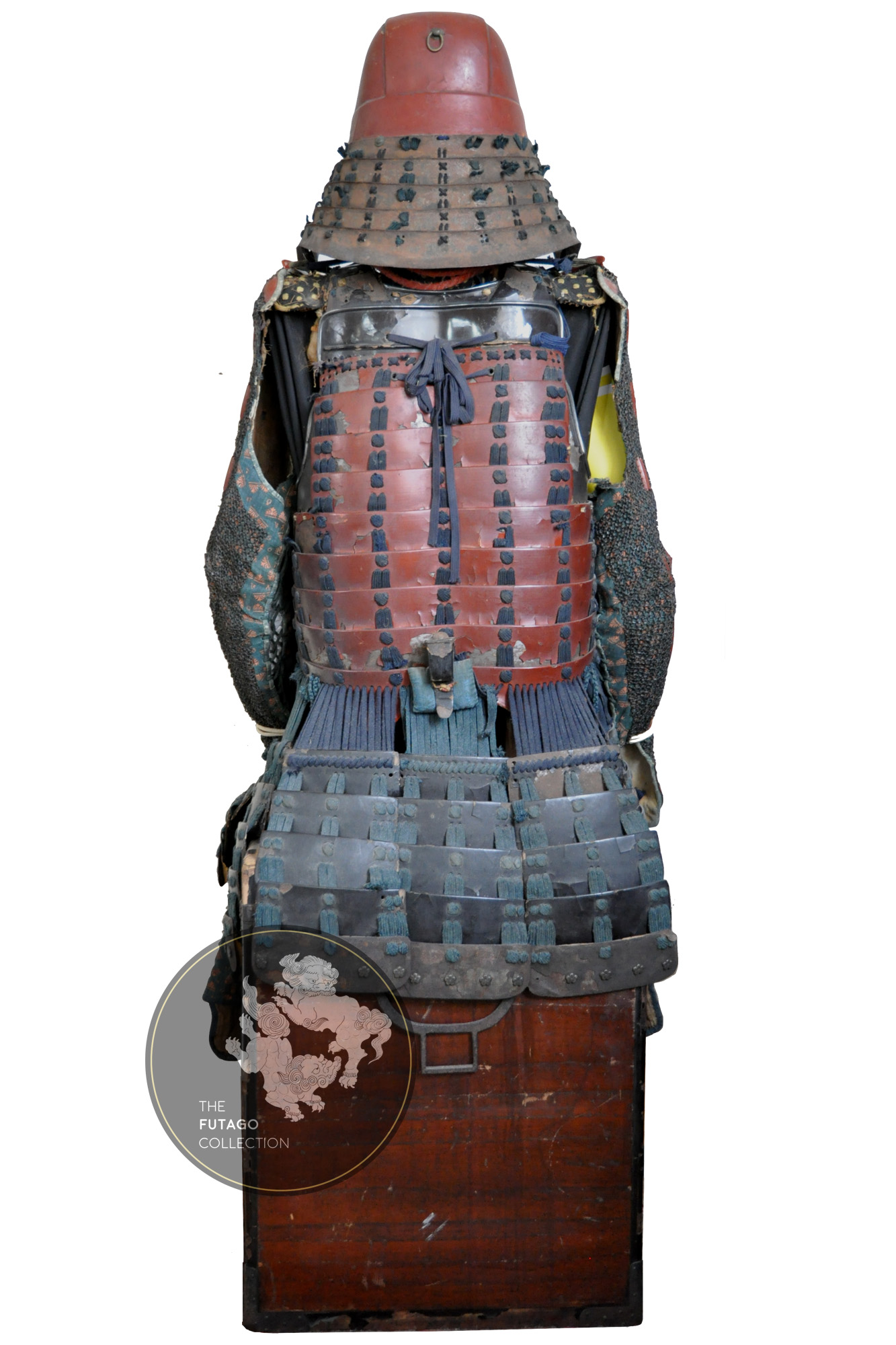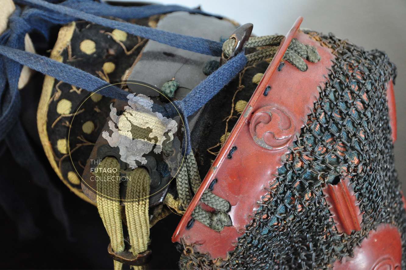 This is the favorite armor of Kimata Morikatsu (1555-1610) who was a close retainer of Ii Naomasa (井伊直政, 1561-1602). The cuirass is a red lacquered Mogami-dō (showing features of the earliest type of Tosei Gusoku). All the elements of the Kanagu-Mawari are trimmed with a silver Fukurin and silver triple Tomoe crests (the main crest of the Kimata family). The lowermost plate of the Gesan (Kusazuri), which is made of iron covered in leather and features silvered sakura-byō decorations.