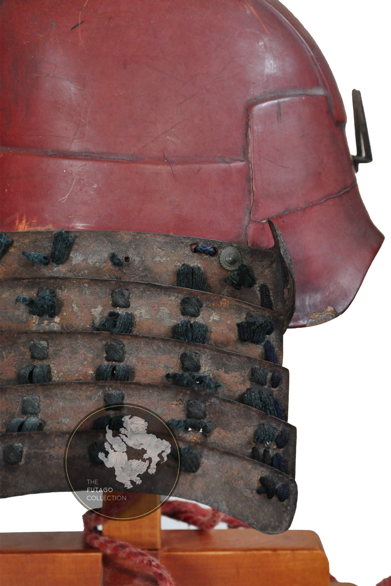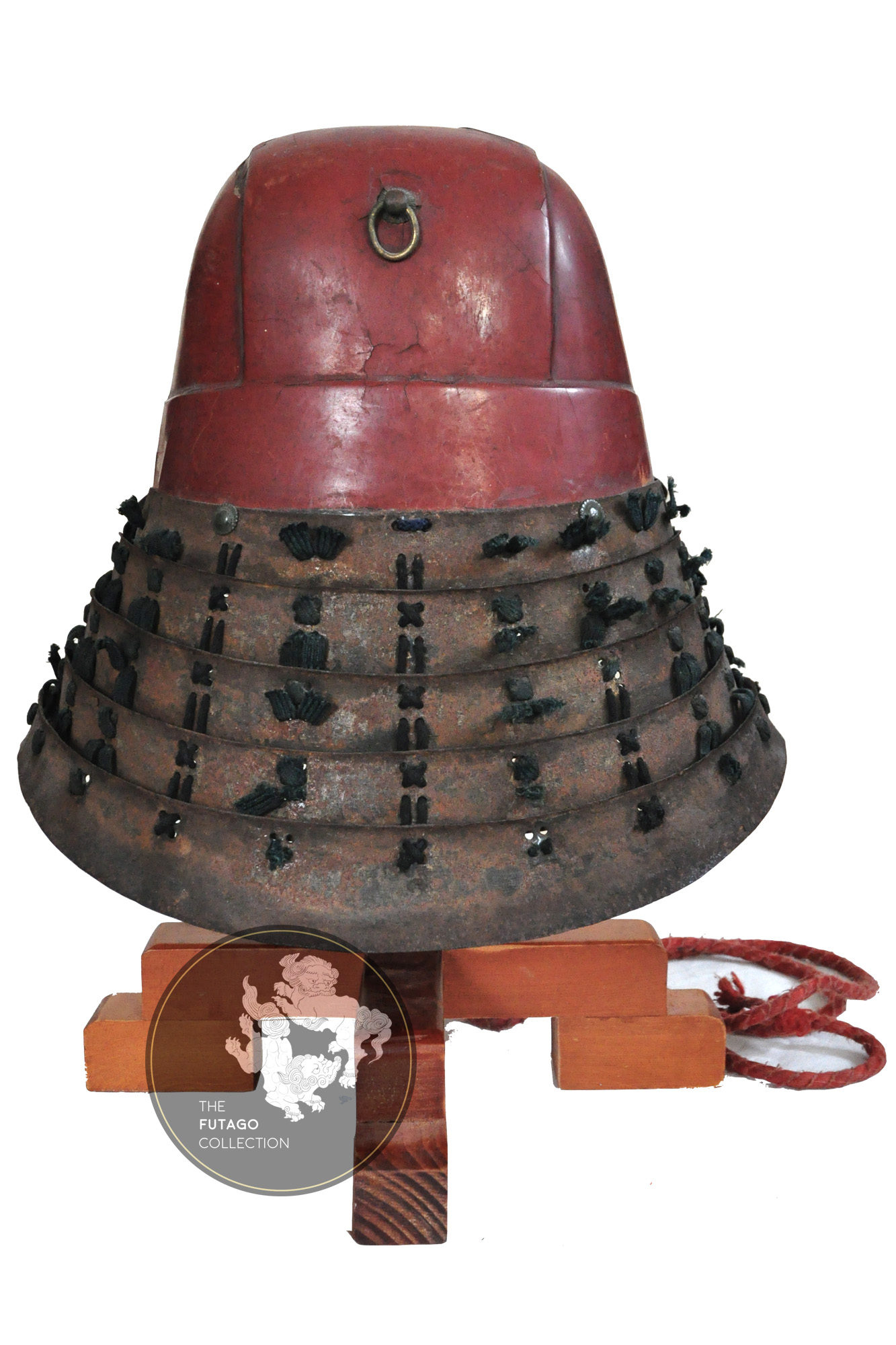 The relatively tall Zunari Kabuto originally is an early Ko Zunari bowl from the mid 16th century which later was remodeled in a classic Zunari when the Mabezashi was transformed and the helmet was covered with red lacquer. Fitted with a Shikoro made of five metal sections with small Fukigaeshi, it represents the tastes and styles from the civil war periods.