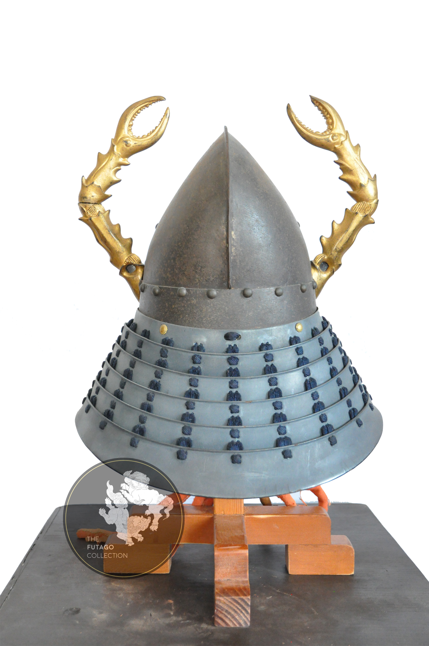 This Nanban influenced peach-shaped helmet made of solid iron is decorated with rivets on the edges and mounted with six-lame Shikkoro lacquered in Byakudan Urushi Nuri, which is the silver variation of the Kin Byakudan, and blue lacing. It is decorated with two golden lacquered wooden carved Crab Arm Wakidate.