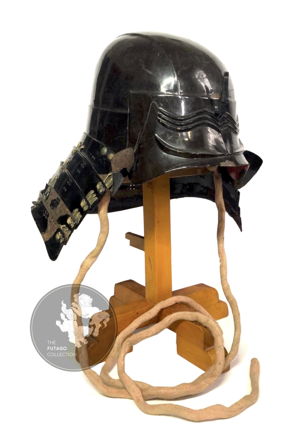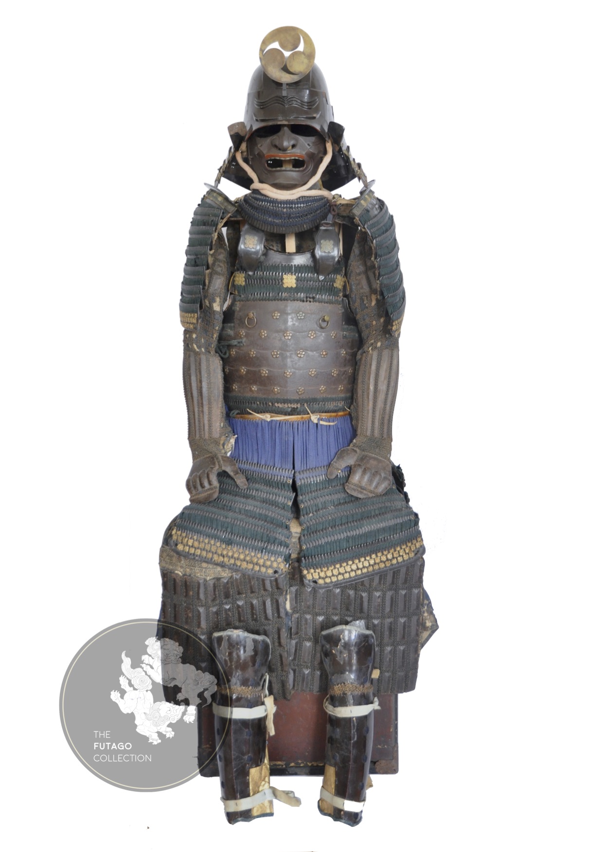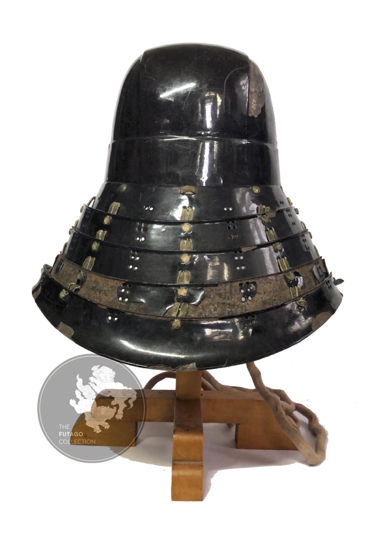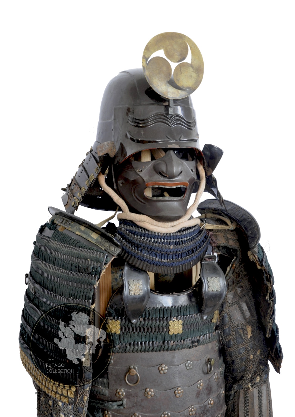 The Armor comprising a dark brownish black-lacquered iron Hineno Zunari Kabuto from the late 17th century which is decorated with embossed (Uchidashi) eyebrows (Mayu) and triple wrinkle rivets (Miage Shiwa) on the Mabizashi.