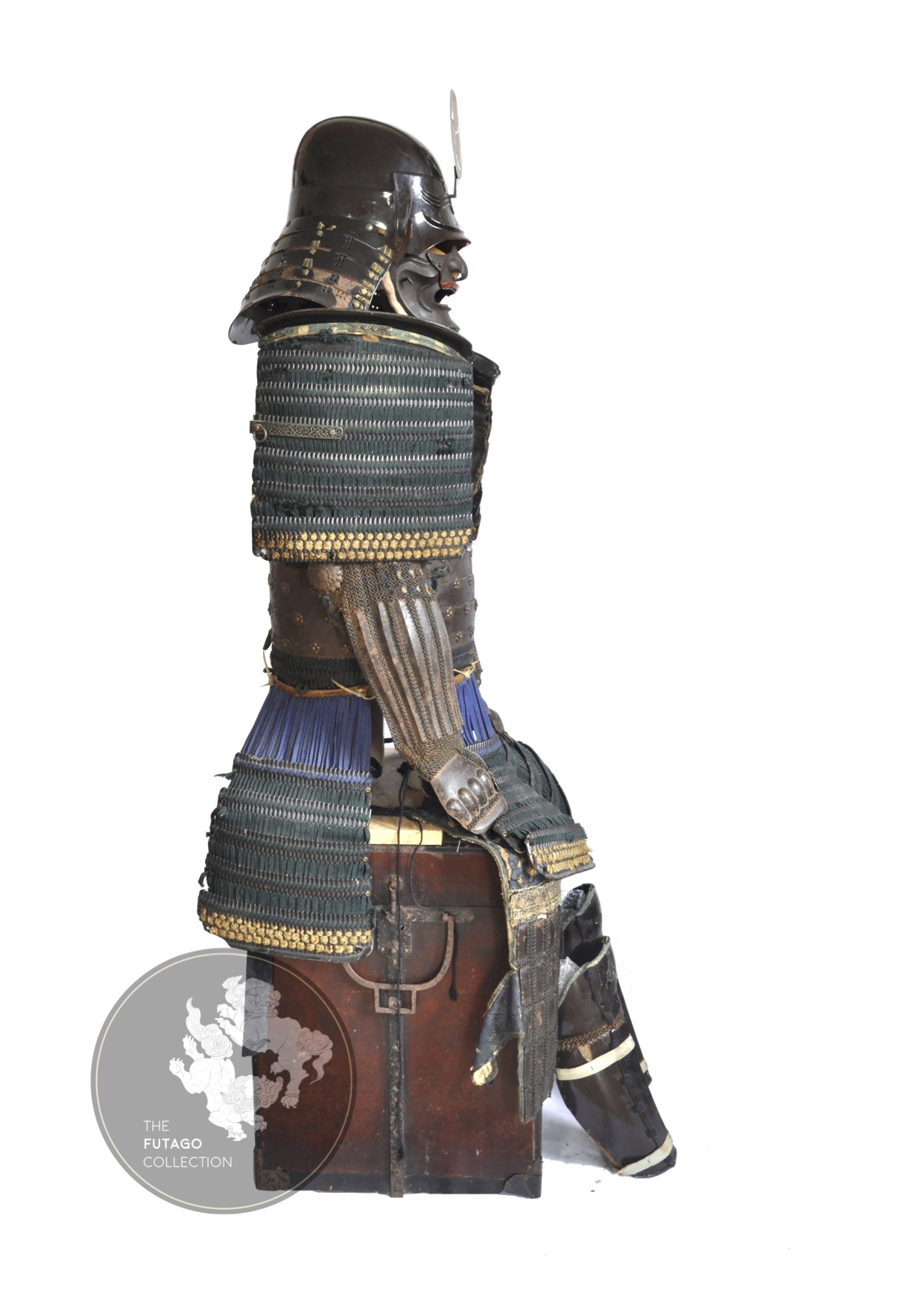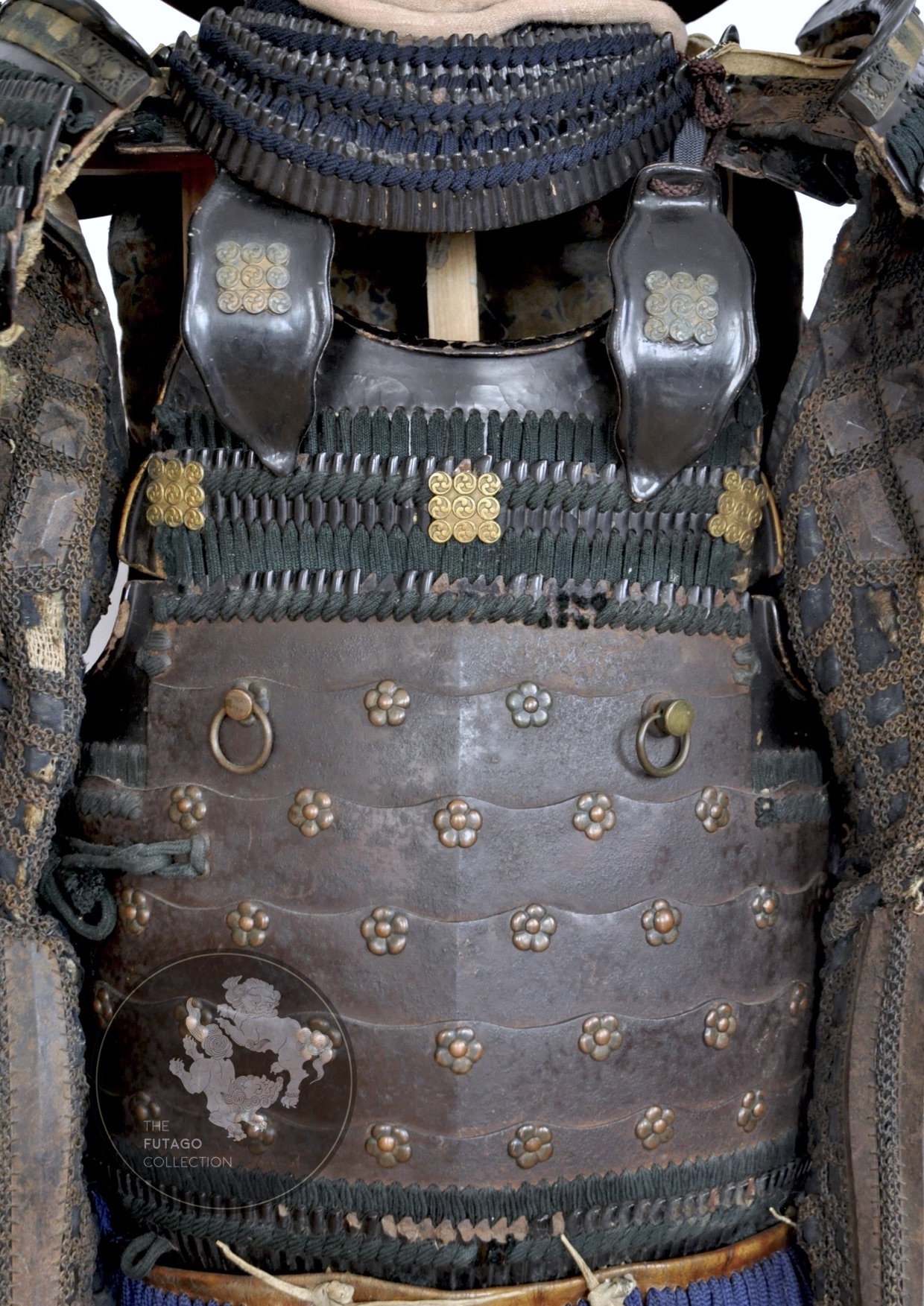 The Cuirass (Go-Mai Yokohagi Okegawa Hatomune dō Gusoku) with horizontally placed plates (rows of individual scales) in the shape of waves (Hira Yamamichi), riveted together with small flower rivets made out of copper and fitted with five sets of five-plated Kiritsuke Kozane Kusazuri laced in blueish dark green and blue.