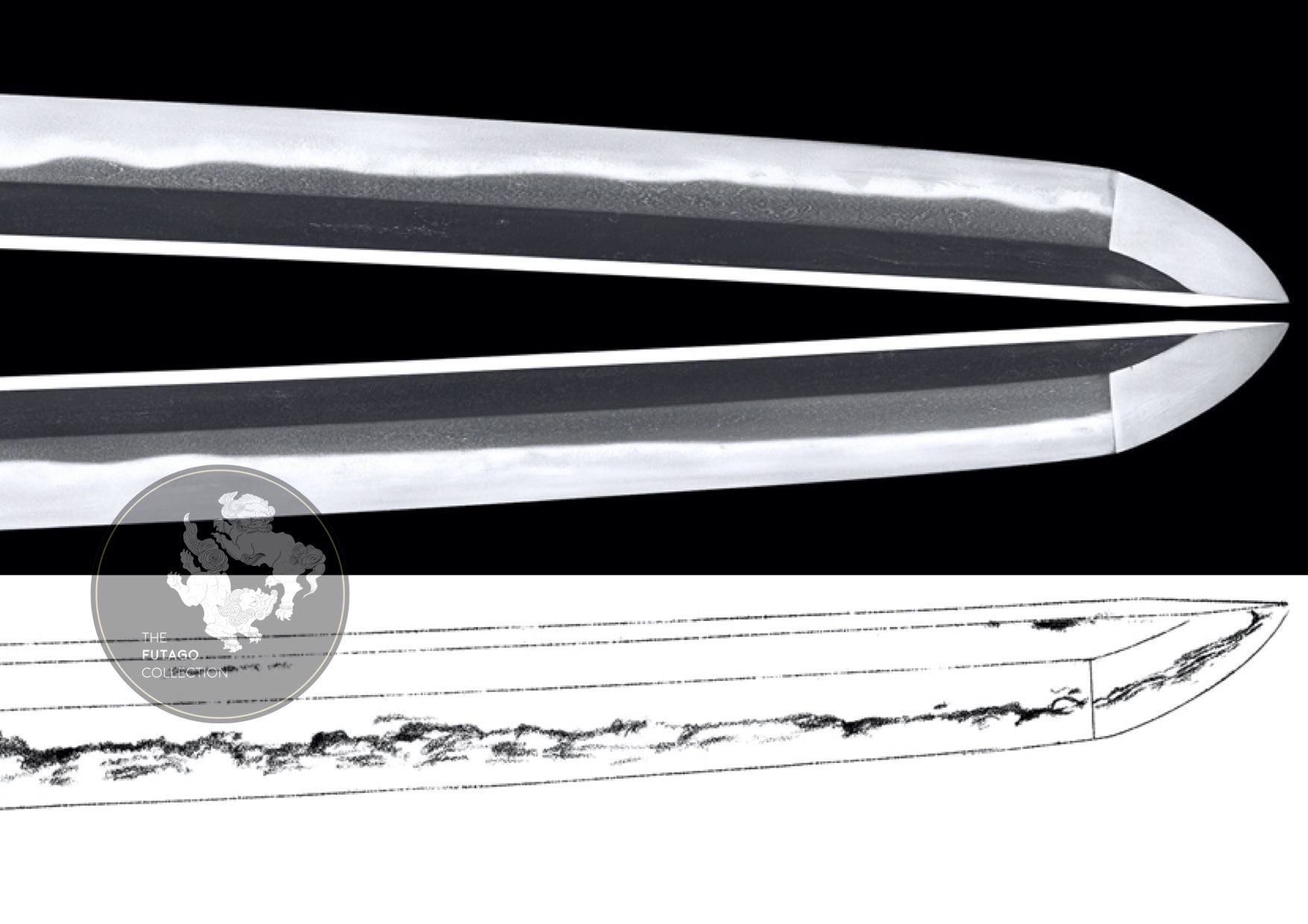 The example we have here is most likely made around from the early Muromachi period to the middle of the Muromachi period (14th/15th Century). It has the style of Hokkoku (Northern province), because of the dark texture appearing the Chikei. (NBTHK Hozon Paper)